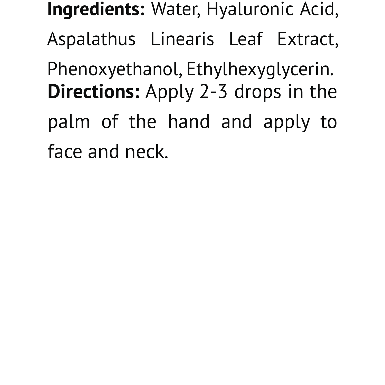 Water, Hyaluronic Acid, Aspalathus Linearis Leaf Extract, Phenoxyethanol, Ethylhexyglycerin.
