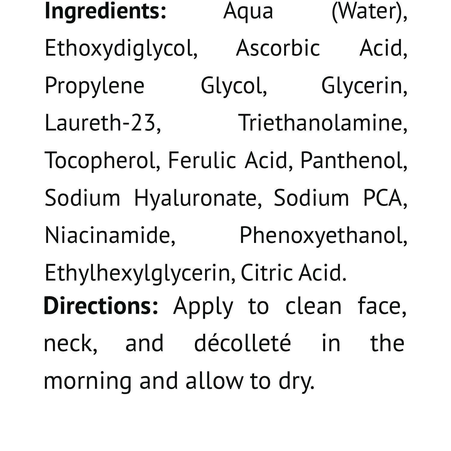 Revitalize your skin with our potent antioxidant serum, meticulously crafted to deliver an unparalleled skincare experience. This dynamic formula harnesses the power of Vitamin C and is fortified with Ferulic Acid, elevating its capacity to combat free radicals effectively. Enriched further with Vitamins B (niacinamide) and E, this concentrated blend forms a robust defense against oxidative damage induced by pollution, toxins, and environmental stressors.
